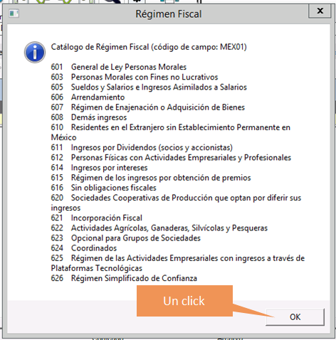 3. Buscamos en la constancia fiscal del cliente a que Régimen pertenece, y buscamos el Régimen Fiscal equivalente en el cuadro superior y damos click en OK.