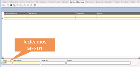 4. Tecleamos en el campo Código la palabra MEX01 y automaticamente en el campo Descripción se mostrará la leyenda Régimen Fiscal del Receptor (CFDI).