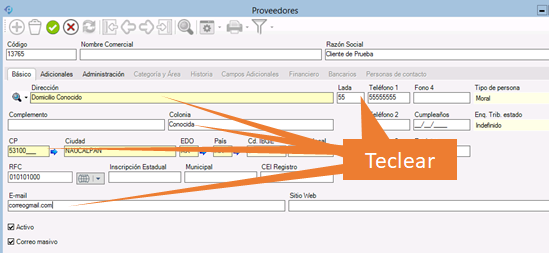 5. Teclear el domicilñio del proveedor: Dirección, Lada, Teléfono, Colonia y C.P.(al poner codigo postal, la Ciudad, Edo (Estado), País, el llenado es automatico, en caso contrario se deberan llenar manualmente) y correo electronico.