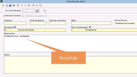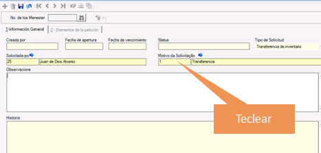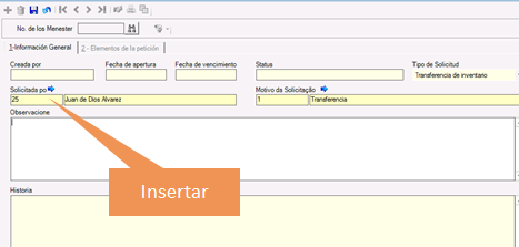 3. Seleccionar Solicitada por. aqui va el numero del solicitante, si no se tiene, es necesario solicitarlo al area de sistemas.