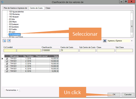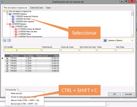 3. Seleccionamos todos los lanzamientos de uno por uno o CTRL + SHIFT + C para seleccionar todos, en la sección de Plan de Gastos e Ingresos seleccionamos 11000000 Ventas de Producto
