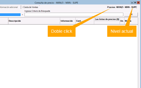 2. Hacer doble click en la etiqueta Precios: {NIVEL} en dónde NIVEL se refiere al nivel actual configurado, asegurarse que siempre se encuentre en Preferencial