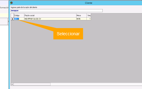 4. Teclear un fragmento de la razón social del Cliente que se va a configurar y a continuación presionar enter.