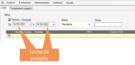 3. Seleccionar 'Periodo - Otorgada', en ambos casos la fecha del día. También se puede usar un intervalo de fechas, es mejor filtrar únicamente el día en curso
