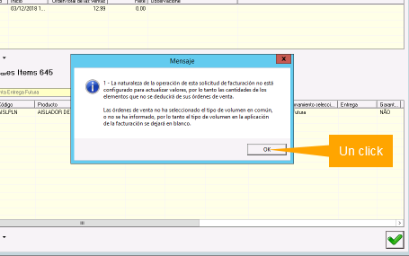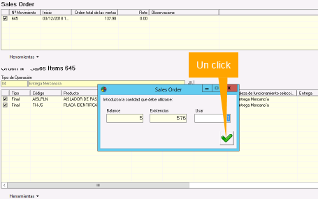 8. Hacer un click en OK.Si se percibe, que el sistema 'No hace nada', quiere decir, como se describe en 'paso 6', que ya se ha generado el pedido de Venta sin Entrega de la Orden de Venta especificada y usted no hizo caso de la advertencia.