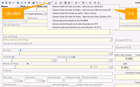 2. Usar el comando F3, o bien click en Herramientas para la generación de Ordenes de fac > Generar Orden de Orden de Venta - Selección por Orden de Ventas.