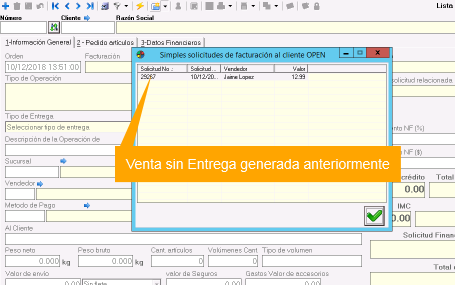 Si recibe una pantalla con una lista de documentos (ver imagen), quiere decir que ya se ha generado entregas parciales de mercancias de la Venta sin Entrega para la Orden de Venta especificada.