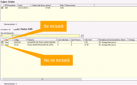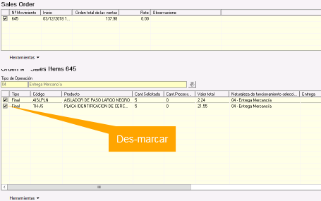 Desmarcar la casilla que corresponde a la partida que desea entregar parcialmente. se puede entregar una partida parcial, sin embargo, no se puede entregar parcialmente un KIT, para poder entregar KITS se necesitan las existencias del total de los componentes que lo componen.
