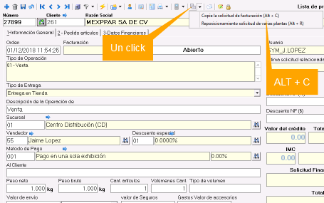 2. Usar el comando ALT + C, o bien click en Copiar > copie la solicitud de facturación.