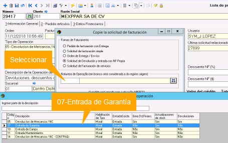 4. Seleccionar Naturaleza de Operación como 07 - Entrada de garantía.