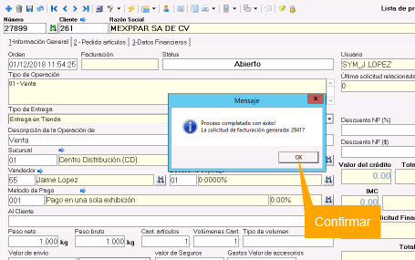 6. Esperar y confirmar el mensaje Proceso completado con éxito. Al realizar esta acción, el sistema automáticamente mostrara la Garantía (Entrada) generada.