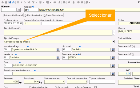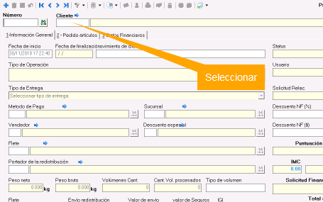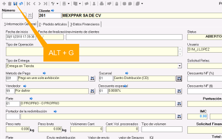 6. Usar el comando ALT + G, o bien click en Guardar. Esta acción automáticamente nos dirigirá a la pestaña 2-Pedido artículos.