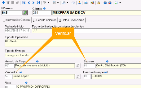 7. Ingresar en 1-Información General y verificar los campos Sucursal y Vendedor. El sistema de forma predeterminada llena estos campos, se debe verificar que la información sea correcta.