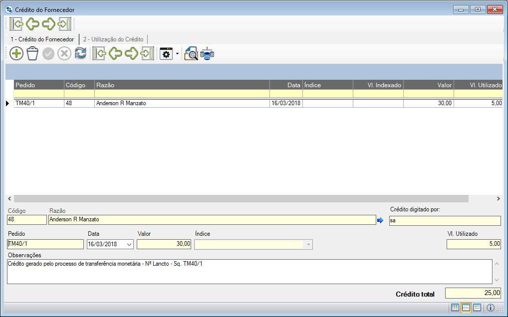 El mantenimiento del crédito del Cliente y del Proveedor puede tener sus valores agregados de forma manual o automática al comprar o vender un producto. Todavía es posible utilizar el crédito para pagar / recibir importes y, para los créditos de clientes, transferir los importes a otra empresa (base de datos) mediante la Gestión de créditos de varias plantas.
