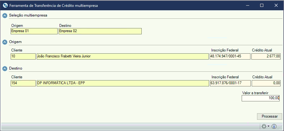 Esta herramienta transferirá el crédito de un cliente de una empresa a otra, y para ello es necesario realizar la configuración en Mantenimiento de la Configuración de Transferencia de Crédito Multiempresa.