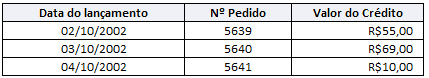 El 20/10/2002 el mismo cliente realizó una compra por el monto de R $ 130,00 y utilizó el pago a crédito disponible. En este caso, se utilizaron los montos de crédito totales ingresados el 2/10 y 3 y parte del crédito registrado el 04/10, ya que el cliente no tenía un solo crédito en el monto total de la compra. Mira la mesa:
