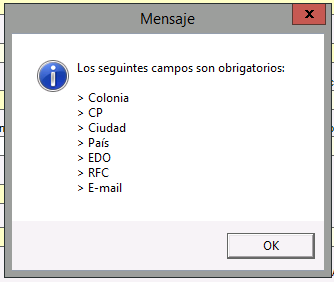 Cuando se omite capturar algún campo obligatorio, el sistema no permitirá guardar el registro, y mostrará un mensaje indicando cuales campos obligatorios faltan de capturar.