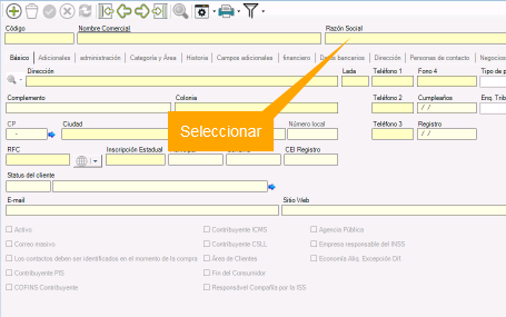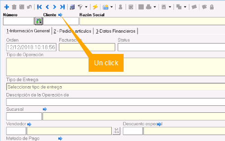 Ubicar y hacer un click en botón Búsqueda del Cliente. Este se puede encontrar generalmente enfrente de los campos que corresponden a Código de Cliente y Razón Social del Cliente, si no lo encuentra seleccione el campo Razón Social y presione Enter.
