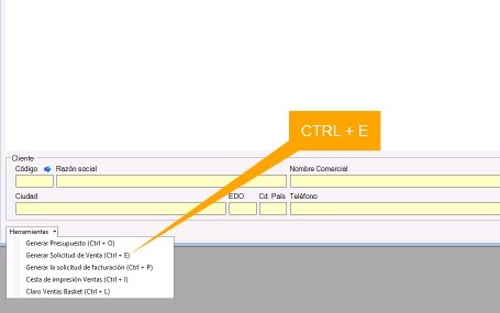 1. Usar el comando CTRL + E, o bien click en Herramientas > Generar Solicitud de Venta