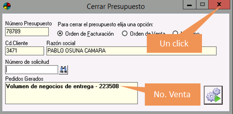 4. Tomar nota del número de la Venta generada por el presupuesto y Cerrar.