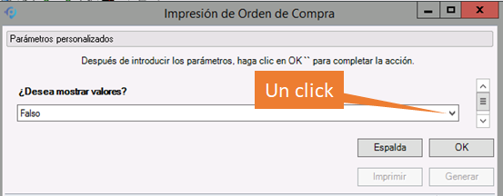 3. en la ventana selecionar la opción de Falso, esto permite que los costos y los datos financieros de los productos no salgan en el listado de recepción de mercancias en el almacen y despues damos click en OK para se genere el reporte.