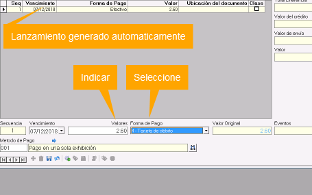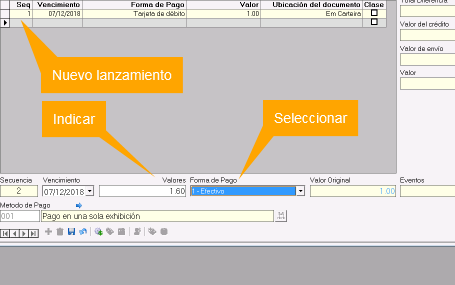 Usar el lanzamiento generado por el sistema e indicar Valores y Forma de pago. Como primer lanzamiento se debe capturar el cobro más alto y la Forma de Pago correspondiente
