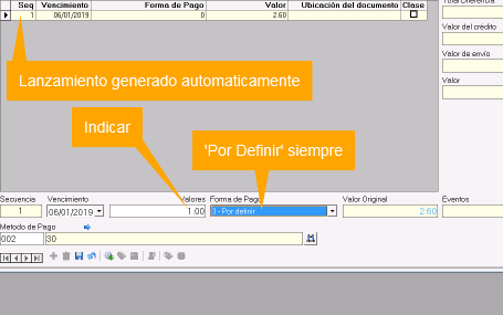 Usar el lanzamiento generado por el sistema e indicar Fecha de Vencimiento, Valores y Forma de pago. Para ventas a crédito, la Forma de Pago, debe ser siempre Por Definir.